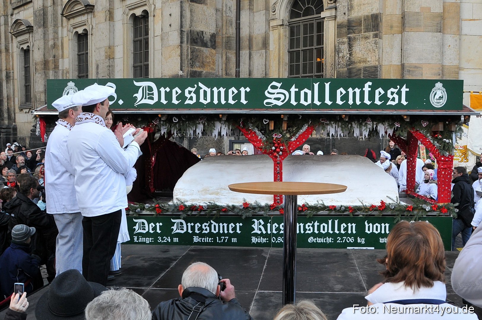 Wohl nirgendwo sonst auf der Welt schenkt man einem „Kuchen“ so große Aufmerksamkeit. Und nirgendwo sonst kann man in einem Fest gleich zwei Superlative sehen: den größten Stollen und eines der größten Messer der Welt. In einem farbenfrohen Festumzug, der so genannten Stollenprozession, fahren die Bäcker und Konditoren der sächsischen Metropole dabei einen fast drei Tonnen schweren Riesenstollen durch ihre Stadt. Das gewaltige Exemplar (3,24 Meter lang, 1,77 Meter breit, 80 Zentimeter hoch), das unter anderem aus etwas mehr als 1,7 Millionen Sultaninen, 340 Kilogramm Butter, 204 Kilogramm Zucker, 165 Kilogramm süßen und bitteren Mandeln, 104 Kilogramm Zitronat und Orangeat, rund 681 Kilogramm Mehl sowie einem Fass Rum besteht, entspricht einer detailgetreuen Vergrößerung eines typischen Dresdner Vier-Pfund-Christstollens und wird auf einem von zwei Pferden gezogenen Fuhrwerk zehntausenden Schaulustigen in der barocken Altstadt präsentiert und anschließend auf dem ältesten deutschen Weihnachtsmarkt teilweise für einen guten Zweck verkauft. Inzwischen gilt das Stollenfest als Höhepunkt des berühmten, 577 Jahre alten Striezelmarktes.