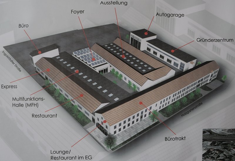 Inzwischen wurde auch die Gastronomie fest vergeben, die sich mit einer Seite nach außen zur Ingolstädter Straße erstreckt. Ein Freisitz ist im Innenhof des Geländes geplant. Um den industriellen Charakter zu unterstreichen, wird im Gastronomiebereich, im Turm sowie im Foyer mit Betonestrich gearbeitet, der als Sichtbeton-Fußboden bleibt. Ergänzend bieten variabel abtrennbare Tagungsräume die Möglichkeit für Schulungen und private Feiern im Museumsambiente.