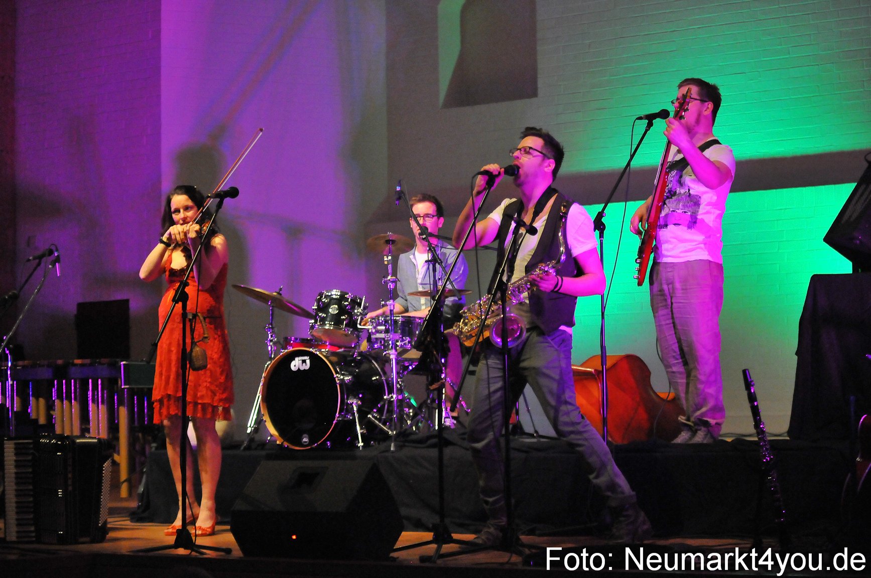 Begeistert haben die neue Spielart der Lieder, die viele noch mitsingen können und auch die Virtuosität der einzelnen Musiker, die wie selbstverständlich innerhalb der Musikinstrumente und auch der Instrumentgruppen durchgewechselt haben. Da gab es Hackbrett und Harfe, Sopransaxophon und Mundtrompete, Akkordeon, Gitarre und eBass, Geige, Schlagzeug und Steeldrums, Trommeln, Kontrabass, Xylophon, und sogar eine Vuvusela. Nur statt dem Flügelhorn, das Stefan Pellmaier doch nicht mehr so schnell noch dazu lernen konnte, gab es bei „Bei der Linden“ eine Mundtrompete, die aber dann kaum vom Original zu unterscheiden war. Und wenn Luz Amoi es schafft, dass das Neumarkter Publikum nach dem ersten Lied bereits stürmisch applaudiert und vor der Pause begeistert pfeift, dann kann man getrost behaupten, dass die Bayrische Weltmusik bei den Neumarkter Zuhörern wirklich gut angekommen ist. Bilder in unserer Bildergalerie…