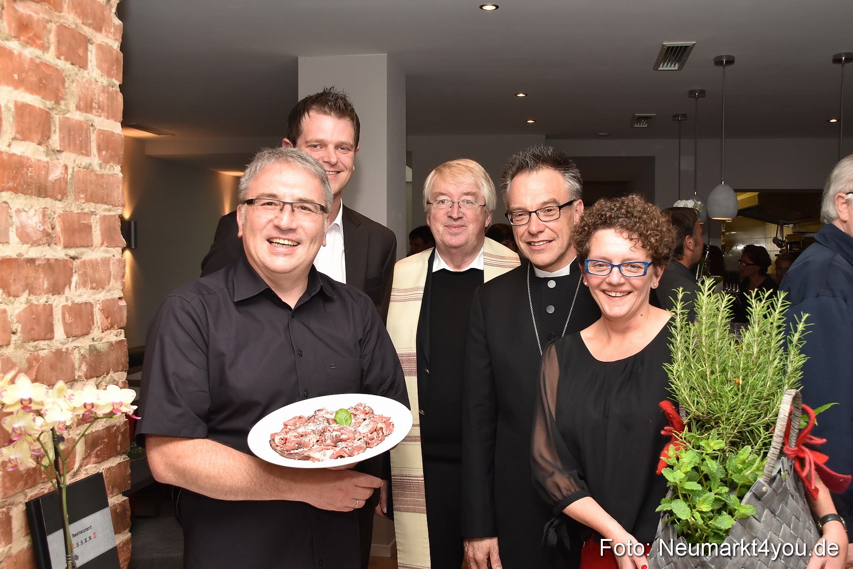 Dekan Richard Distler durfte in diesem Gebäude schon zum dritten Mal bei einer Restauranteröffnung den Segen sprechen. Das Gute daran ist, dass beide Restaurant-Vorgänger immer noch in Neumarkt sehr erfolgreich tätig sind. Nachdem das Ehepaar evangelisch/katholisch ist gab es den kirchlichen Segen am Dienstagabend gleich im Doppelpack. An seine Heimat erinnerten Dekan Dr. Norbert Dennerlein sofort die guten fränkischen Weine aus Castell, die auf der Getränkekarte stehen.