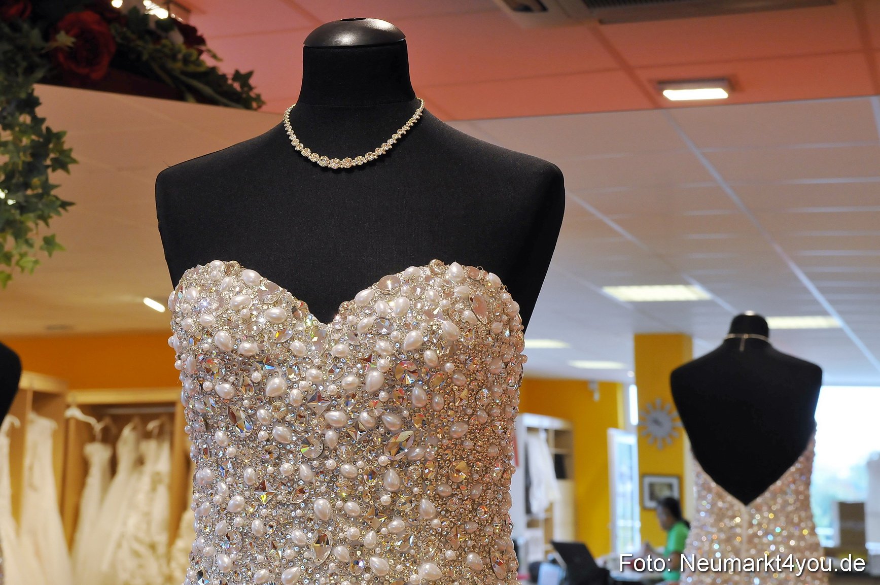 Ein Brautkleid der Extraklasse gibt es im Moment bei Brautmoden Honeymoon in Neumarkt zu bestaunen. Das weiße Brautkleid ist über und über mit zahlreichen schimmernden Glas-Kristall-Steinen besetzt.