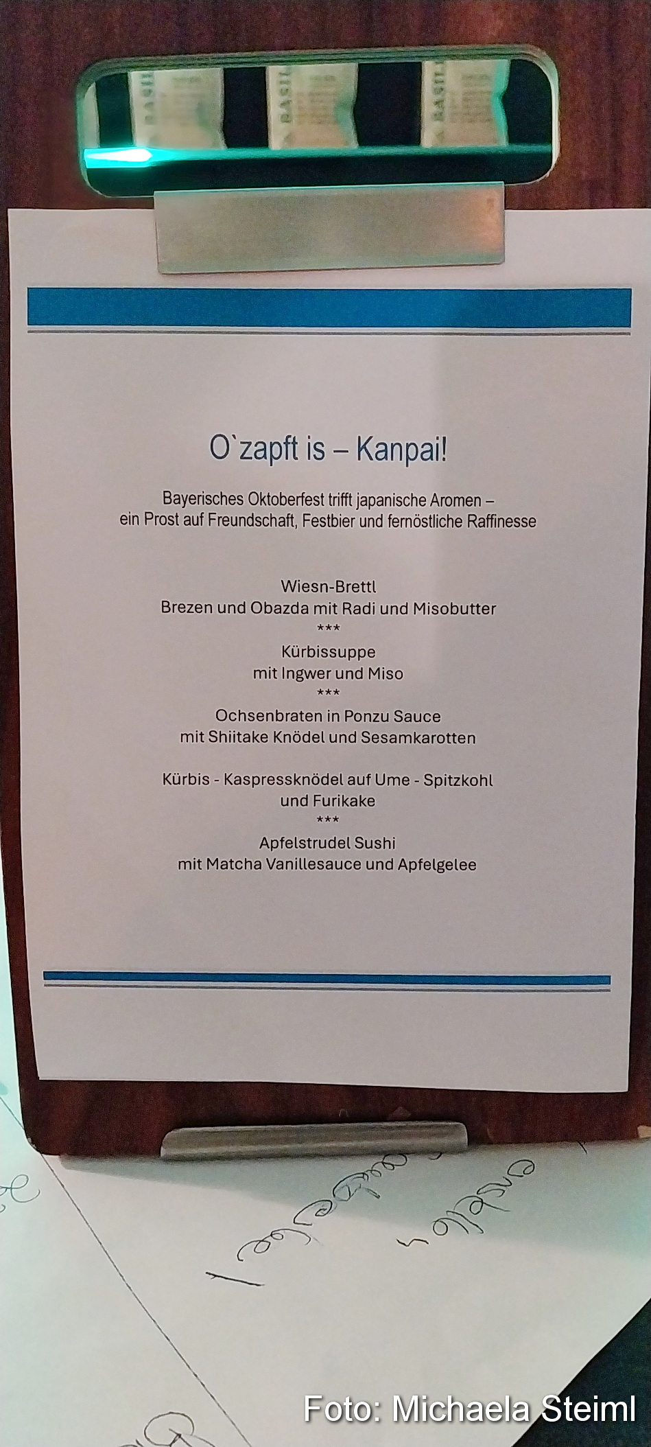 Nur einer hat an diesem Abend zu arbeiten – die Gastgeberin. Beate Schiller (Geschäftsführerin Restaurant Franziskus) kredenzte ein hervorragendes Menü und verzauberte Ihre Gäste mit ihrem eingespielten Team mit kulinarischen Leckerbissen aus Fernost mit dem Motto – O´zapft is – Kanpai! „Bayerisches Oktoberfest trifft japanische Aromen – ein Prost auf Freundschaft, Festbier und fernöstliche Raffinesse“.