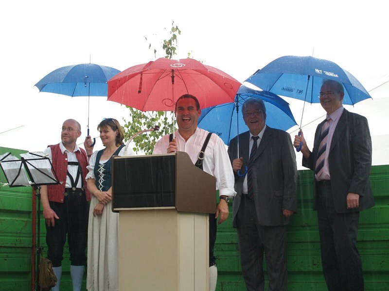 Da aufgrund eines Gewittergusses die meisten Kapellen tropfnass am Festplatz ankamen, wurde der Gemeinschaftschor kurzerhand ins Bierzelt verlagert, wo Kreisdirigentin Anita Hiltner alle Musiker mit Bayernhymne und Deutschlandlied zu einer beeindruckenden Klangkulisse koordinierte.