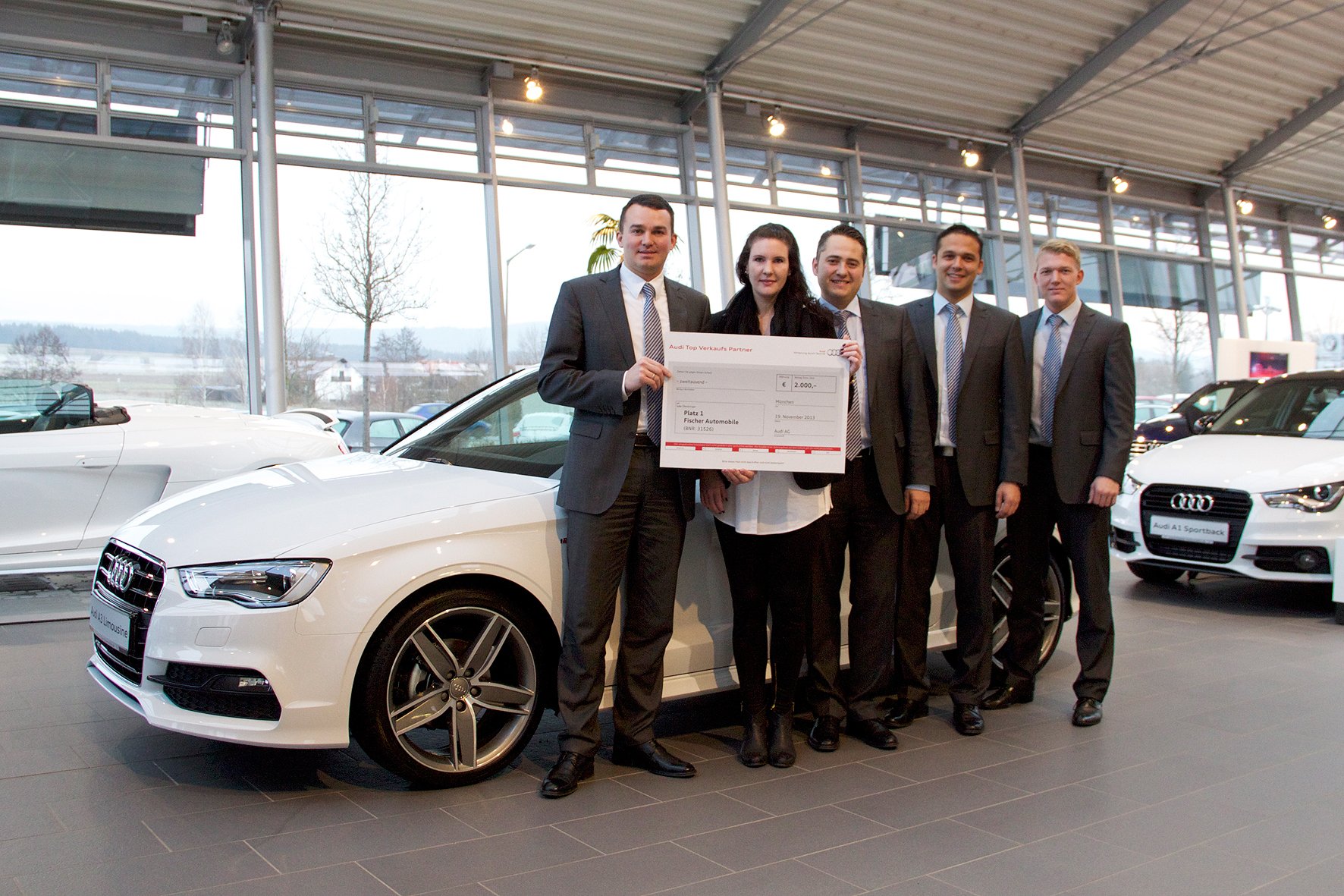 Das gesamte Audi Verkaufsteam hat erfolgreich an einem Pilotprojekt der Audi AG, Region Süd, teilgenommen und wurde nun zum Audi Top Verkaufs Partner 2014 ausgezeichnet. Der Audi Verkauf von Fischer Automobile konnte sich gegen alle anderen teilnehmenden Audi Partner erfolgreich durchsetzen und erreichte am Ende den ersten Platz. Für diesen Wettbewerb waren vor allem die Kundenzufriedenheit, der Umgang mit den Kunden und die Teilnahme an einschlägigen Hersteller-Weiterbildungsmaßnahmen für das Verkaufspersonal entscheidend.