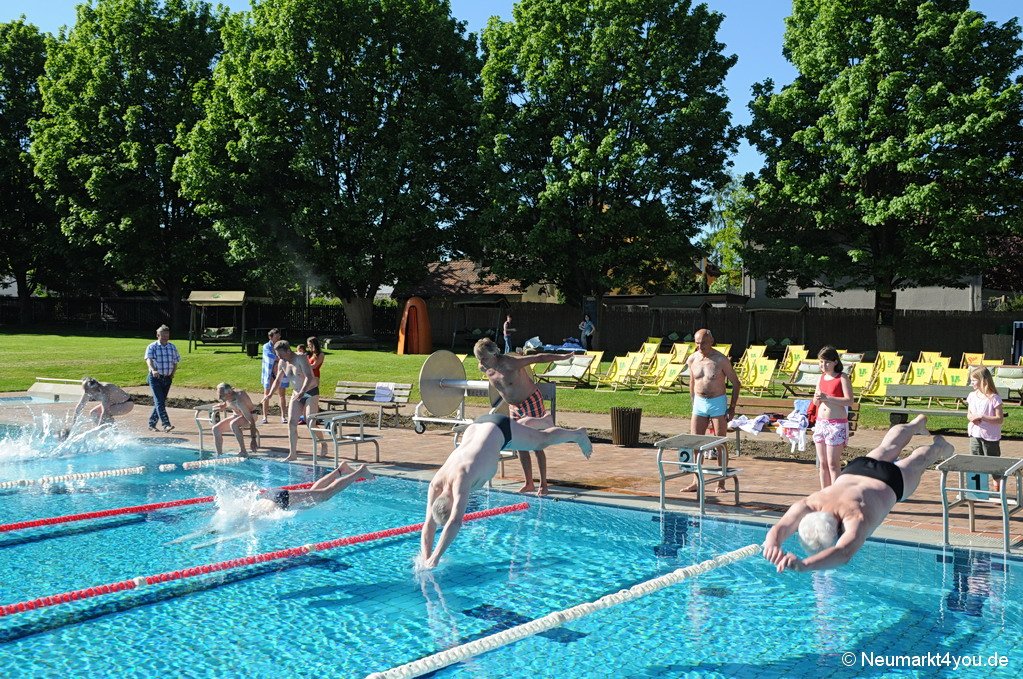 Das traditionelle „Anschwimmen“ der Stadträte eröffnete am vergangenen Samstag die Neumarkter Freibadsaison. Nach dem Startschuß sprang der 2. Bürgermeister Franz Düring allen voran mit einem gekonnten Kopfsprung in die „kühlen“ Fluten des Schwimmerbeckens und brachte die ersten 50 Meter zügig hinter sich.