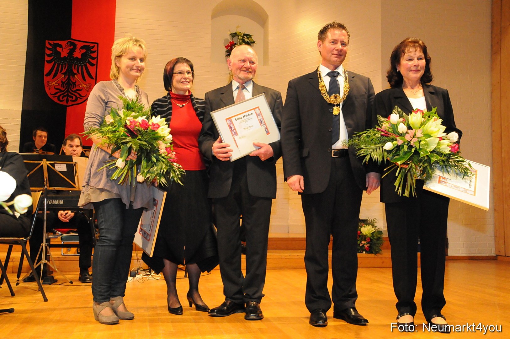 Thumann zog in seiner Ansprache eine positive Bilanz des vergangenen Jahres und hob hervor, dass Neumarkt auch für die kommenden Jahre hervorragend aufgestellt sei. Im Anschluss an Thumanns Rede referierte Prof. Peter Schmieder auf amüsante und unterhaltsame Weise zum Thema „Die Zeitzyklen der Wirtschaft“. Schmieder machte deutlich, dass immer mehr Firmen erkennen, dass das größte Potential in gesunden und zufriedenen Mitarbeitern schlummere. Für Lachsalven sorgte immer wieder die Einlagen von Kabarettist Wolfgang Lasch aus Potsdam, der als „Arnold Böswetter“ eigentlich eine „Laudatio“ halten wollte. Im weiteren Verlauf des Abends wurden die Stillen Helden Neumarkts, Claudia Hofmann, Waltraud Fuchs und Michael Platzer von der Vorsitzenden der Freiwilligenagentur Vera Finn und von Oberbürgermeister Thumann ausgezeichnet. Für die musikalische Umrahmung sorgte die Swingin‘ Connection aus Neumarkt.