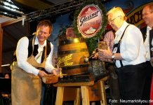 Oberbürgermeister Thomas Thumann hat am Freitag, 10.8.2012 um kurz nach 19 Uhr mit drei gekonnten Schlägen das erste Fass Festbier der Neumarkter Glossner-Bräu angezapft...