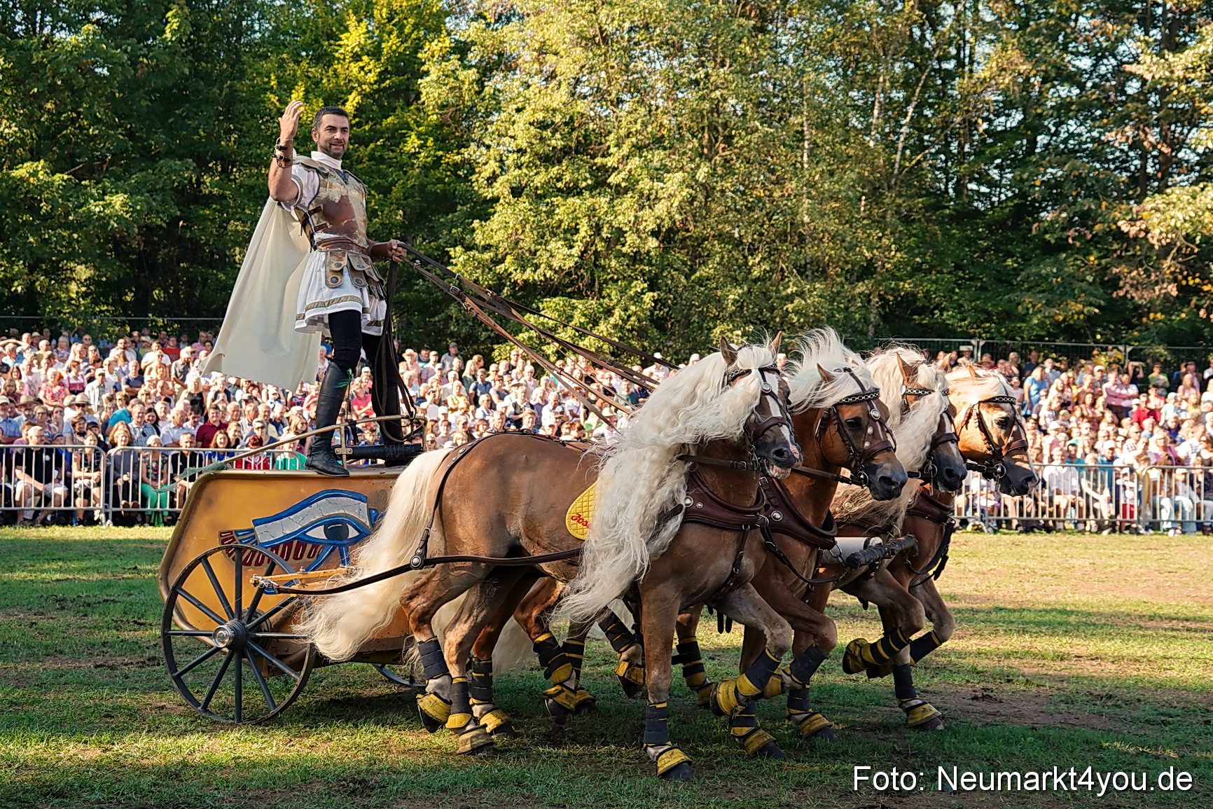 So spektakulär die Pferdeschau begann, ging es weiter und es folgte eine abwechslungsreiche Präsentation der Pferde. „Was wir da zu sehen bekamen, war eine mitreißende Show und eine Demonstration der Vielseitigkeit von Pferden“, so Neumarkts Oberbürgermeister Thumann. „In dieser Form ist das bayernweit nahezu einmalig. Bei uns sind alle Arten von Pferden in einem hervorragenden Programm zu sehen und es wird anschaulich gezeigt, zu was sie fähig sind.“ In dem gut zweistündigen Programm waren 117 Pferde zu bestaunen, darunter befanden sich 61 Kaltblüter. Insgesamt hatten 31 Pferdehalter ihre Tiere zur Schau gemeldet. Kutschen in verschiedensten Anspannungen bis hin zu 8- und 10-Spänner sowie Dressurvorführungen gab es ebenso zu erleben wie Einzelpferde, Reitvorführungen oder Ponys, sowohl freilaufende als auch Kutschen ziehende.