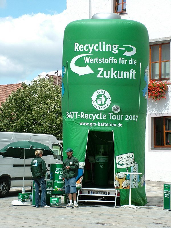 Gerätebatterien und Akkus enthalten Wertstoffe, die sich durch das Batterierecycling zurückgewinnen und wieder verwerten lassen. Doch obwohl die Menge der in Deutschland jährlich zurückgegebenen Batterien steigt, werden noch immer viel zu viele Batterien in den Haushalten gehortet oder landen sogar im Hausmüll. Um Abhil-fe zu schaffen und die Verbraucher aufzuklären, ist die BATT-Recycle Tour vom 30. Juli bis zum 01. August 2007, jeweils von 11.00 bis 18.00 Uhr, zu Gast auf dem Rathausplatz in Neumarkt.